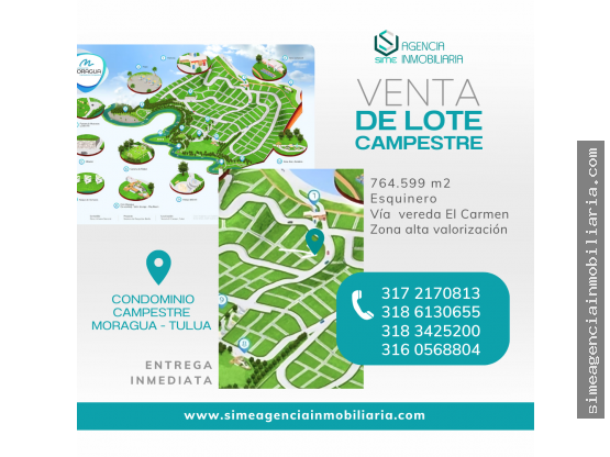 Se vende lote campestre, en el polo urbanístico de mayor valorización en la región. A sólo 5 minutos de Tulúa en un clima privilegiado, rodeado por la naturaleza. Moragua se ubica sobre la vía que conecta Tulúa con la vereda El Carmen en la ruta de la futura despensa agrícola más importante para el Valle del Cauca y Colombia.